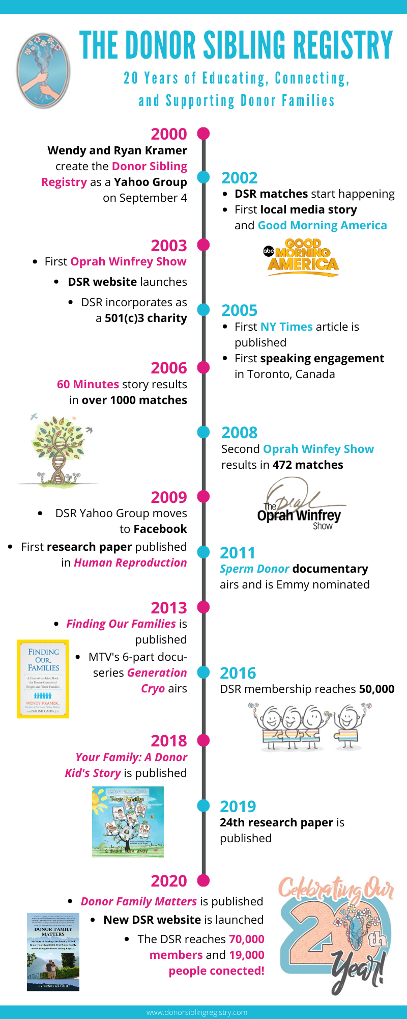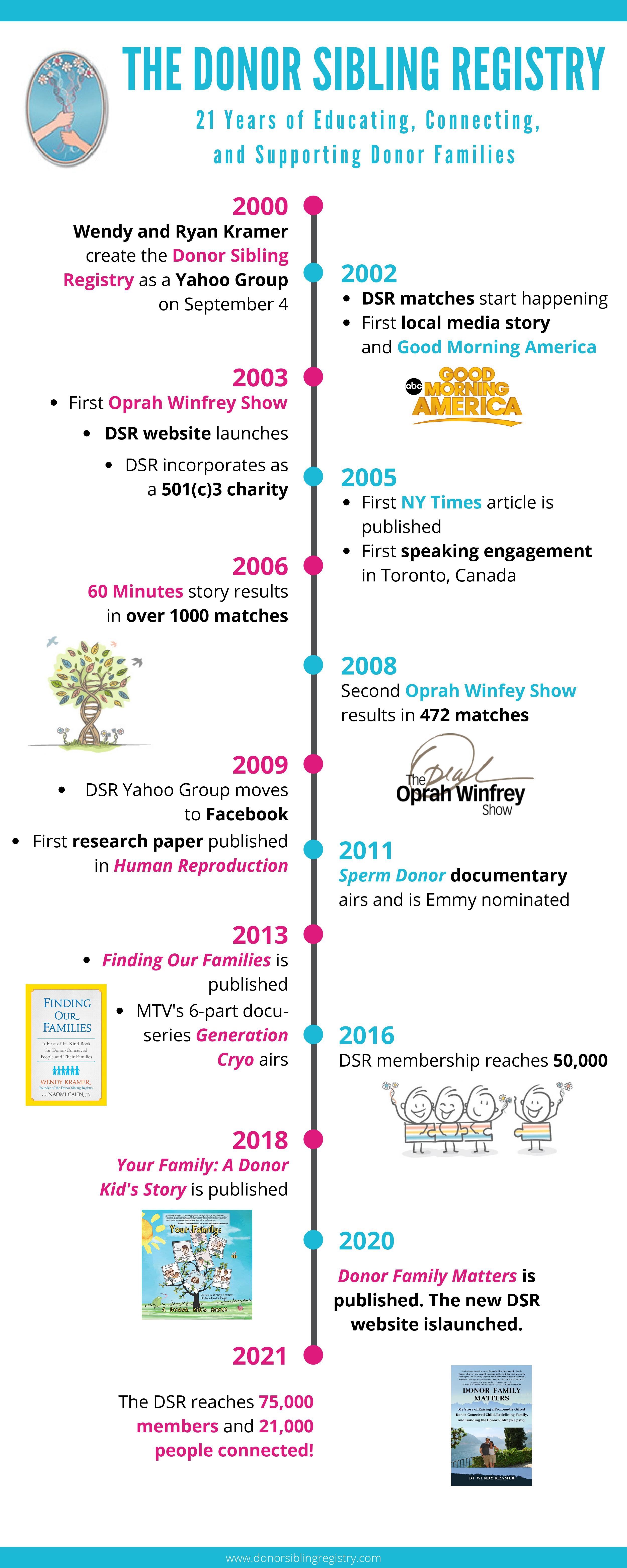 The Donor Sibling Registry (DSR) was founded in 2000 to assist individuals conceived as a result of sperm, egg, or embryo donation who are seeking to make mutually desired contact with others with whom they share genetic ties. Donor siblings, donor offspring, parents of half-siblings, biological parents: all donor family connections. Without any outside support, the DSR has pioneered an international discussion about the donor conception industry and donor families, through research, media appearances, speaking engagements, and interviews. The DSR advocates for the right to honesty and transparency for donor-conceived people, promotes social acceptance and legal rights, and values the diversity of all families.