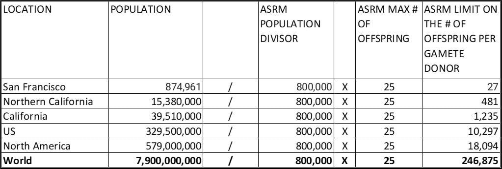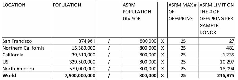 The American Society of Reproductive Medicine came up with guidelines that sound like a limit without actually being a limit; it's a formula that limits donor use to no more than 25 pregnancies per donor in a population of 800,000. There is no limit, it's a trick: Divide the population of any city, state, country by 800,000 then multiply by 25 to get the number of offspring the donor is allowed to have in that city, that state, that country, etc.