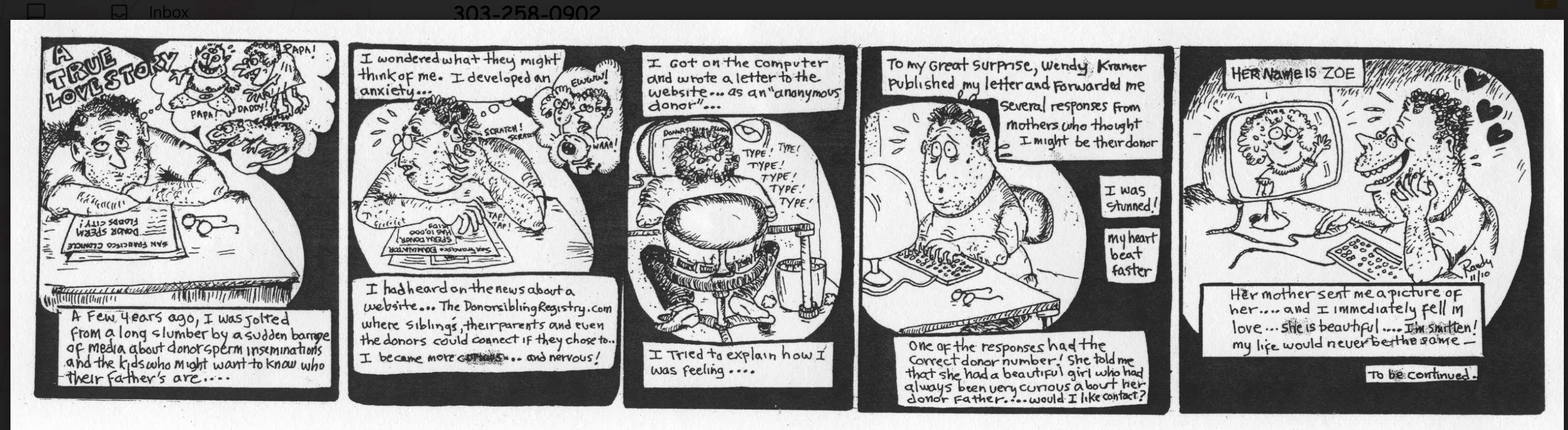 "Time slowed. Colin felt adrift. He scoured the internet for advice, other stories like his, a life raft he could grasp to guide his thoughts. He couldn’t find his situation reflected anywhere. During his search, he happened upon the website for the Donor Sibling Registry. Its cofounder, Wendy Kramer, was the mother of a donor-conceived child. Frantically pacing an empty cafeteria at work, he gave her a call. She had heard the story before and calmly directed him to some resources."